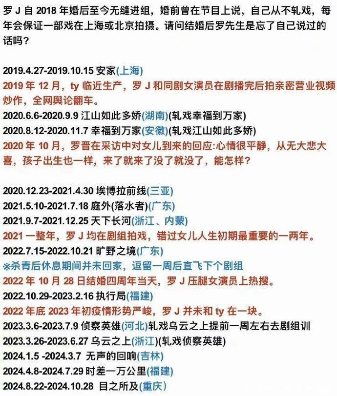 网上突然流传出罗晋结婚七年的行程表,看得人心里直发凉。那几年他几乎没怎么在家待过,不是在横店、象山这些影视基地拍戏,就是赶去下一个剧组的路上。一�天,能有几天留在上海陪家人,真是个谜。尤其女儿刚出生那会儿,正是最需要父亲的时候,可照片里的唐嫣,总是孤零零一个人抱着孩子,连个背影都等不来。